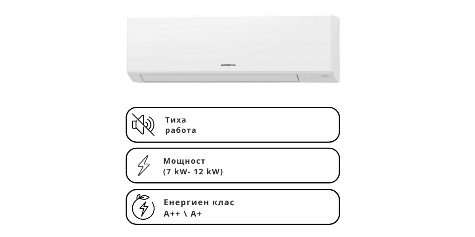 Серия KLTA на General Fujitsu представя модели в три мощности – 7 000, 9 000 и 12 000 Btu. Тези климатици се характеризират с компактния си размер от 770 мм ширина, който позволява гъвкави решения при монтаж в ограничени пространства.