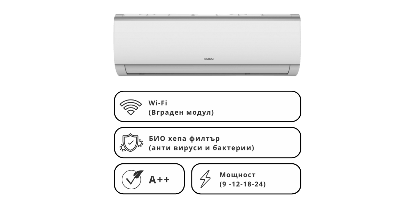 KAISAI FLY съчетава всичко, което очаквате от един модерен климатик – енергийна ефективност, надеждна работа дори при екстремни температури, пречистваща въздуха система и достъпна цена.