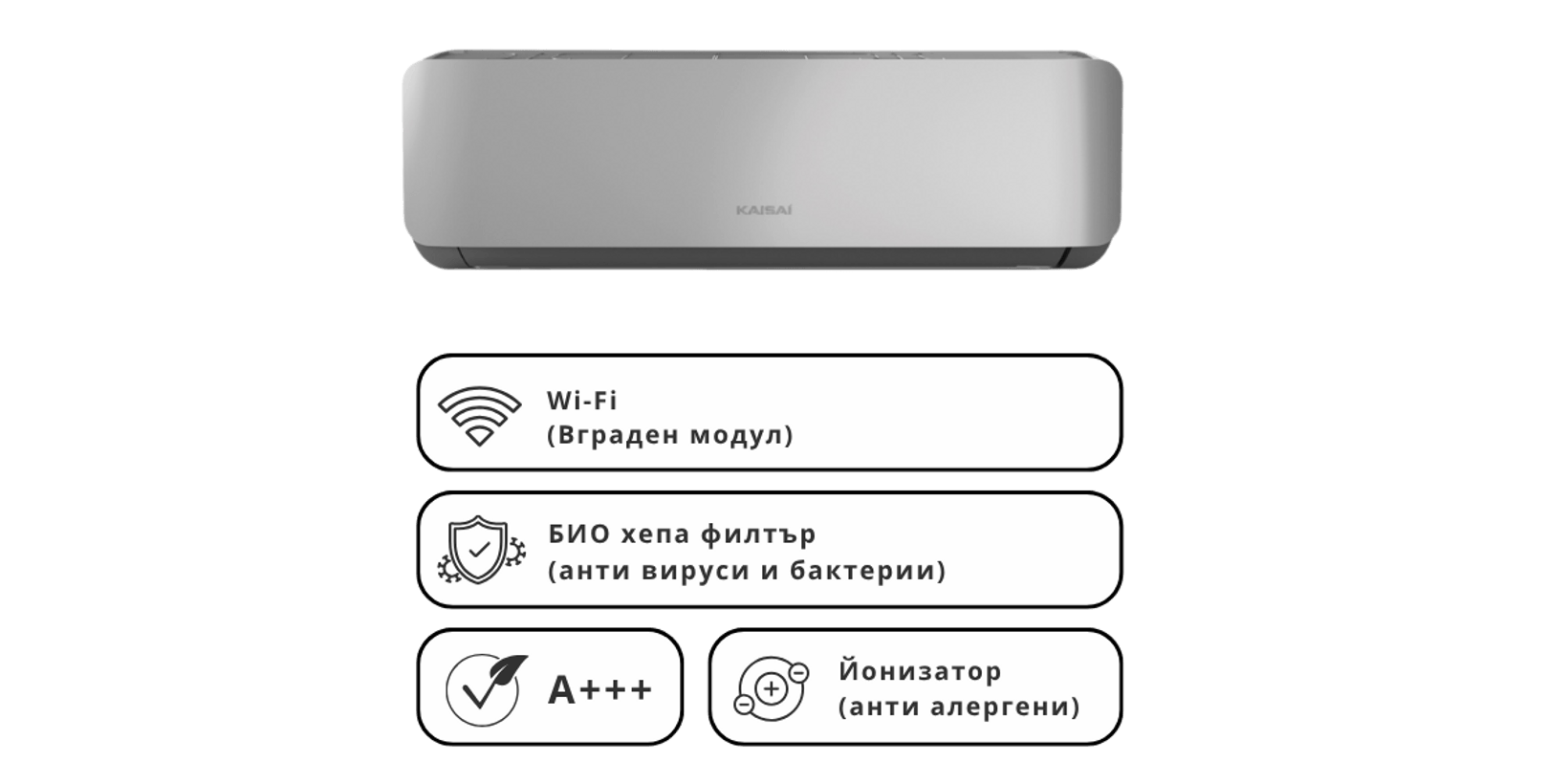 С елегантния си сребристо-черен корпус, KAISAI Geo допълва безупречно всеки съвременен интериор. Подходящ е както за жилищни помещения, така и за модерни офис пространства.